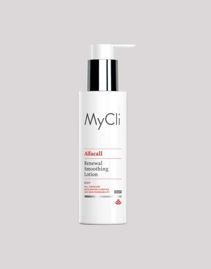 MyCli Alfacall Glättendes Erneuerungsfluid – Nachtpflege ist eine flüssige Emulsion für den Körper mit hohem Gehalt an Alpha-Hydroxysäure, die mit den MyCli-Anti-Aging-Protokollen kompatibel ist. Ihre Formel verbindet 6 Aktivwirkstoffe, davon ein Komplex aus drei Säuren (Glycol-, Brenztrauben und Lactobionsäure) sowie einer Bündelung von Molekülen der neuesten Generation, die zielgerichtet auf der gesamten Körperoberfläche eine leichte, aber fortschreitende exfolierende und hautbildverfeinernde Wirkung hat. Für eine geglättete, strahlende und entspannte Haut.