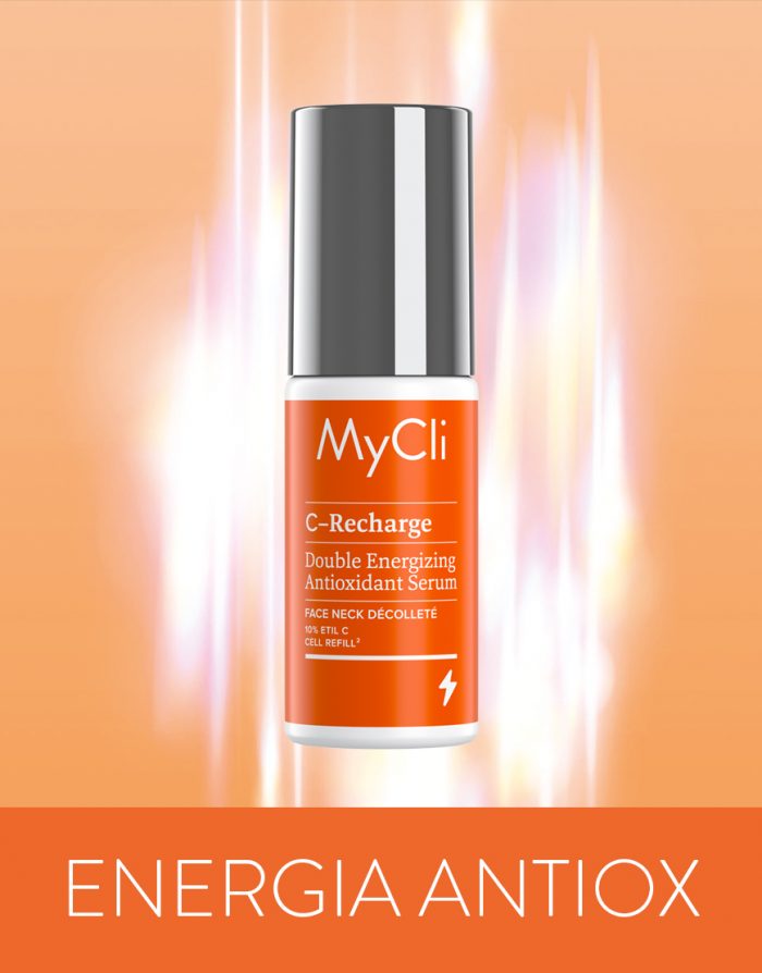 MyCli C–Recharge potenzia l’efficacia antiossidante della vitamina C con un complesso esclusivo di carnitina e ribosio – Cell Refill² – che stimola il mitocondrio a ricaricare le cellule di energia e contrasta i danni indotti dai radicali liberi. Una doppia azione che rende la pelle più ossigenata, vitale e resiliente. L’alta concentrazione di vitamina C promuove un’azione intensiva e la texture ultra sottile in siero permette un’efficace penetrazione degli attivi per risultati rapidi e duraturi.