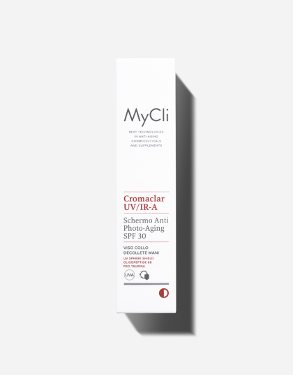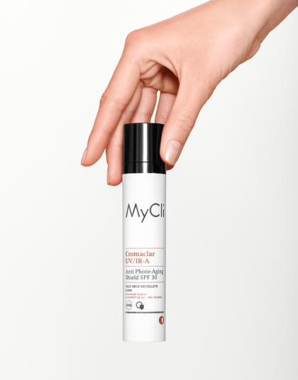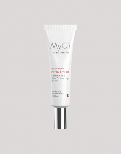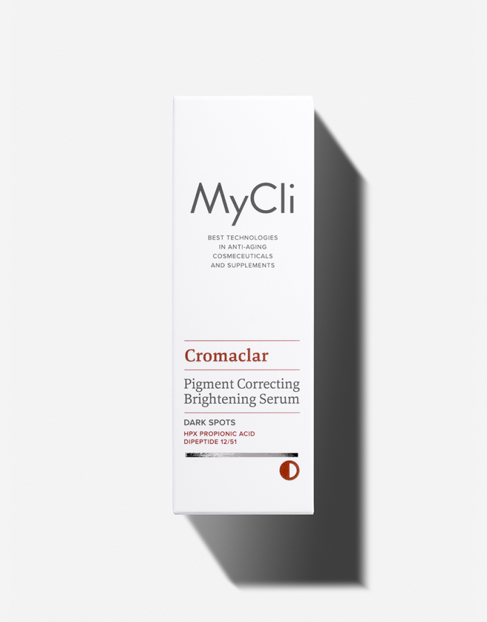 MyCli CROMACLAR Serum ist eine ultrakorrektive Behandlung für hyperpigmentierte Bereiche mit braunen Flecken. Die Formel mit enzymatischer aufhellender Wirkung auf Flecken beteiligt sich an der körpereigenen Melaninproduktion, indem sie die Freisetzung von Melanin durch die für die Produktion verantwortlichen Zellen – die Melanozyten – blockiert und damit das Auftreten dunkler Flecken verhindert. Sie vereinheitlicht zudem den Teint und wirkt dem Photo-Aging entgegen – für eine helle, strahlende Haut. Integrierte mikromolekulare Technologie auf Grundlage von Hydroxyphenoxypropionsäure, Dipeptid 12, Dipeptid 51, Niacinamid und Vitamin C.