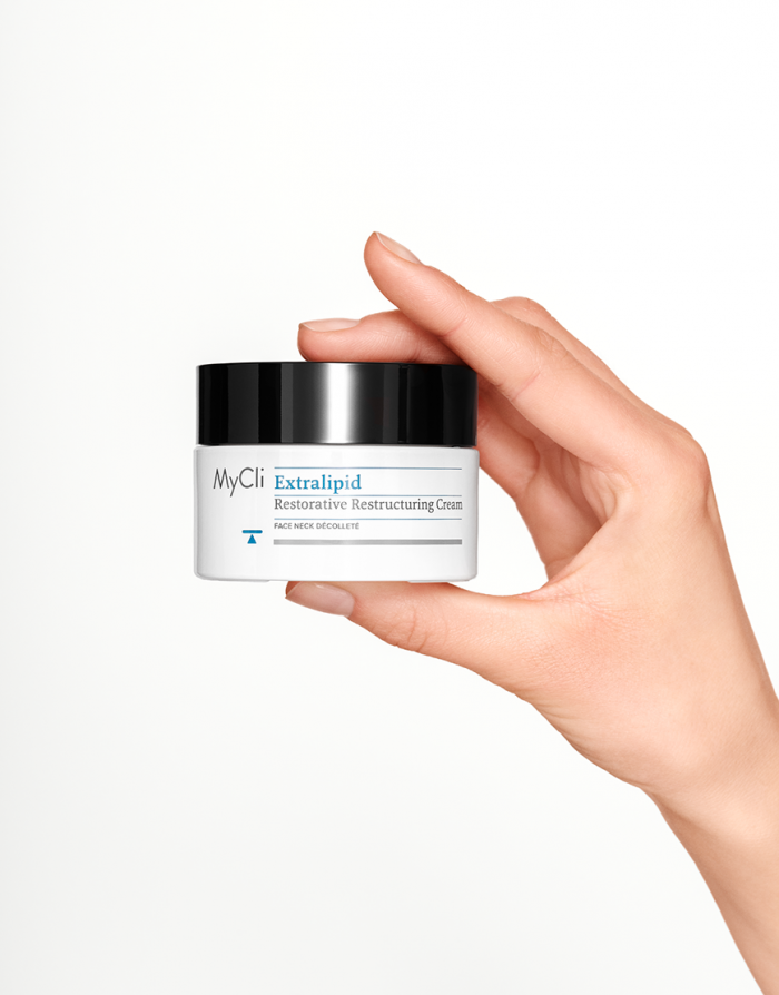 MyCli Extralipid Creme ist eine Aufbaubehandlung der Hautbarriere mit rückfettender und festigender Wirkung. Die Formel des Produkts bringt die endogene Produktion von Hautlipiden in Gang und schenkt trockener, sehr trockener oder gestresster Haut oder Haut, die nach professionellen Hautverjüngungsbehandlungen eine Reparatur- oder Pflegehandlung benötigt, dauerhafte Durchfeuchtung, tiefenwirksame Versorgung mit Nährstoffen und Wohlbefinden. Die Formeltechnologie auf Basis von Ceramid 3, biomimetischen Lipiden, Cholesterin, Allantoin, Natrium PCA und Palmitamid MEA unterstützt den Wiederaufbau der Epidermis. Die Haut wird kompakt, weich und elastisch.