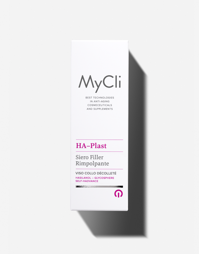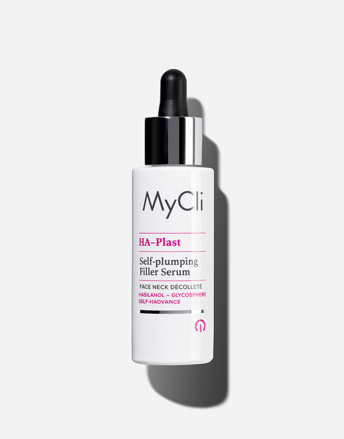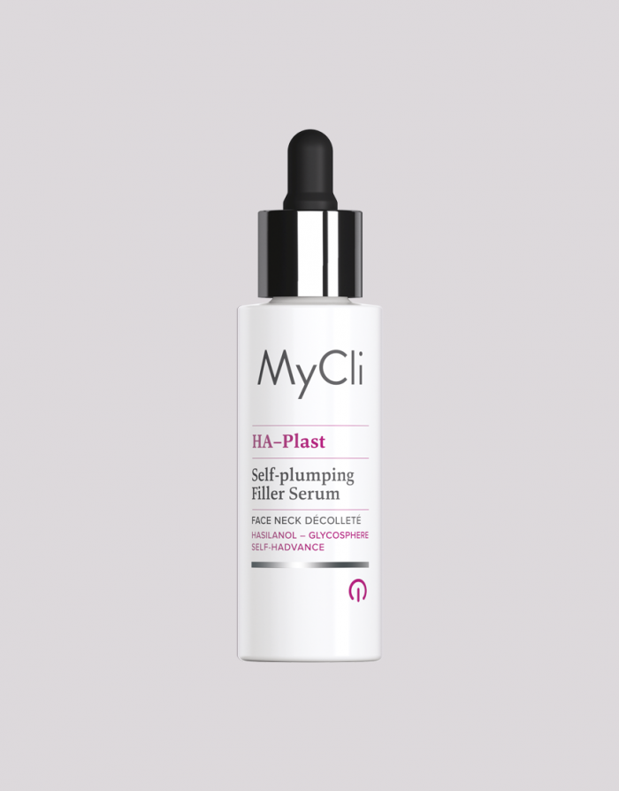MyCli HA-Plast ist eine verstärkte Fluid-Behandlung mit einem hohen Gehalt an Vorläufern der Hyaluronsäure, die der Haut Volumen geben. Ihre Formel bringt die Produktion von endogener Hyaluronsäure in Gang und schenkt der Gesichtshaut Plastizität und Volumen. Darüber hinaus verstärkt sie die Aktivität der Fibroblasten, verbessert die Anordnung der Substanzen in der extrazellulären Matrix und fördert die Hautdurchfeuchtung. Die Haut wird elastisch und geschmeidig und sichtbar kompakter und praller. Mikromolekulare Technologie auf der Basis von: spezialisiertem Silanol, Glykogen und Tripeptid, das die Produktion endogener Hyaluronsäure anregt.