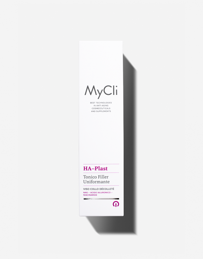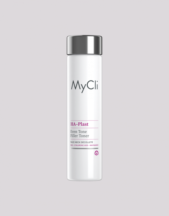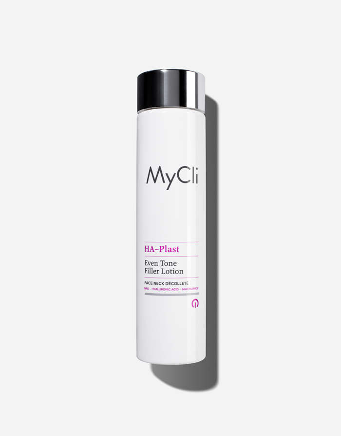 MyCli HA–Plast Gesichtslotion ist eine Lotion für den täglichen Einsatz, welche die Reinigung abrundet und die Haut auf nachfolgende Anwendungen vorbereitet. Die Formel bringt die Produktion endogener Hyaluronsäure in Gang. Sie schenkt der Haut Geschmeidigkeit und Feuchtigkeit und wirkt ungleichmäßiger Pigmentierung entgegen. Für einen gesunden und gleichmäßigen Teint. Der schnell einziehende hydrophile Trägerstoff stellt den perfekten Abschluss der täglichen Reinigung von Gesicht, Hals und Dekolleté sicher, bevor das entsprechende Anti-Aging-Protokoll zur Anwendung kommt, und fördert ein optimales Eindringen der Wirkstoffe in die Haut. Integrierte mikromolekulare Technologie auf Basis von NAG, Hyaluronsäure und Niacinamid.