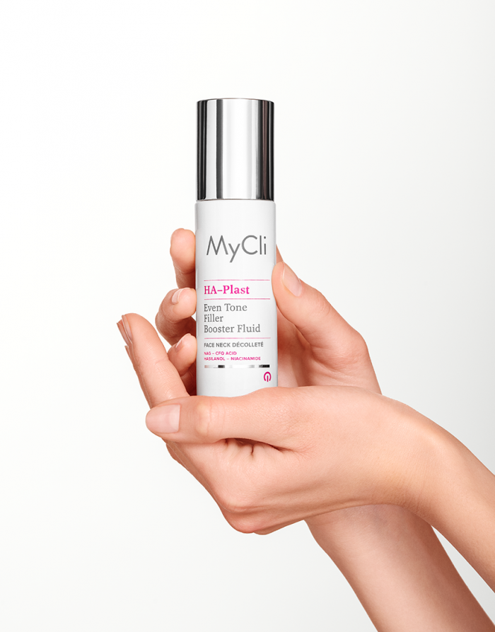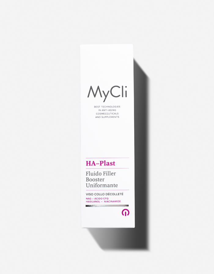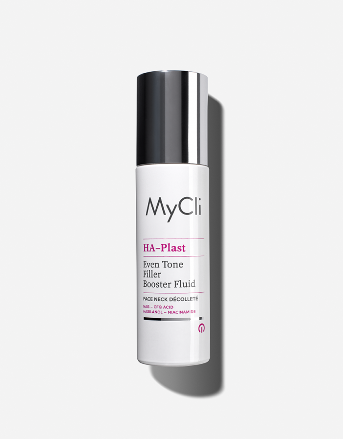 MyCli HA-Plast Filler-Booster-Fluid für einen gleichmäßigen Teint ist eine leichte polymerische Emulsion mit auffüllendem Effekt. Ihre Formel regt die Produktion von endogener Hyaluronsäure an, verleiht der Haut Plastizität und wirkt dem Verlust von Volumen entgegen. Zudem verstärkt sie die Aktivität der Fibroblasten und erhöht die Durchfeuchtung der oberen Hautschicht. Für eine pralle, volle und sichtbar hydrierte Haut. Integrierte mikromolekulare Technologie auf Basis von: NAG, Caffeoylchinasäure, Niacinamid und spezialisiertem Silanol.