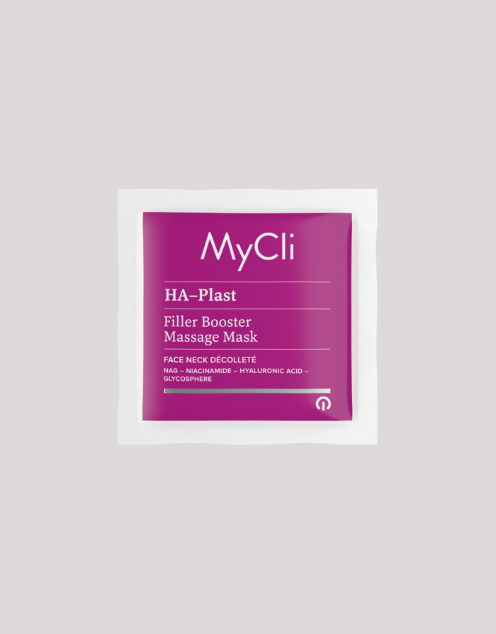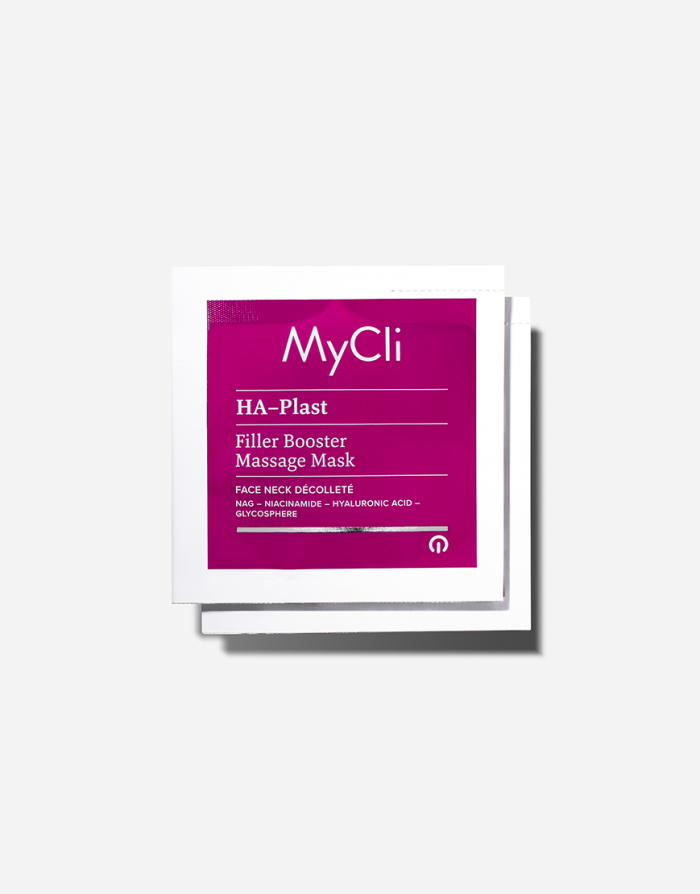 MyCli HA-Plast Massage-Mask ist eine Anwendung mit auffüllender Wirkung, die die Mikrozirkulation der Haut anregt. Ihre Formel bringt die Produktion von endogener Hyaluronsäure in Gang und verleiht der Haut Plastizität und Weichheit. Darüber hinaus eignet sich der innovative Trägerstoff für eine punktuelle Massage in den entsprechenden Bereichen, wodurch die Feuchtigkeitsversorgung der Epidermis und die Kompaktheit und Prallheit der Haut sofort erhöht werden. Integrierte mikromolekulare Technologie auf Basis von NAG, Glykogen, Niacinamid und Hyaluronsäure.
